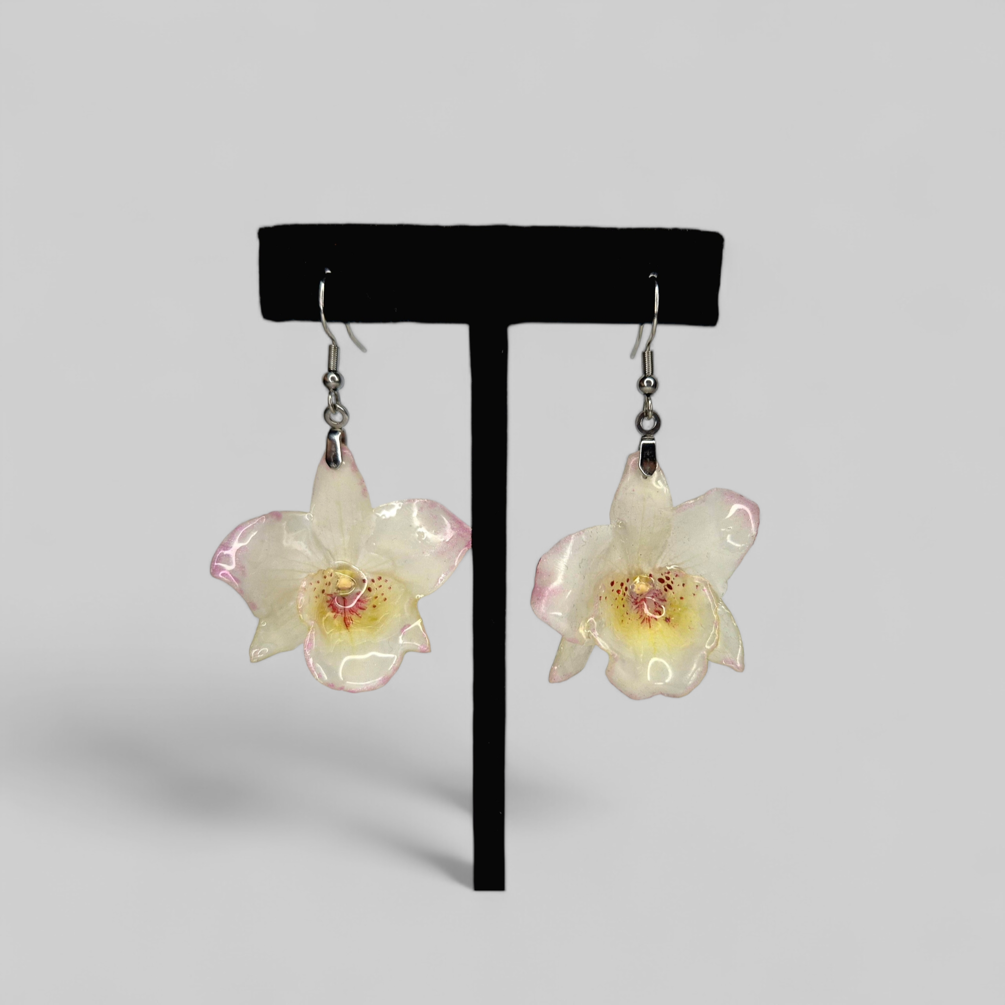 Piękne kwiaty popularnych storczyków zatopione w żywicy z zachowaniem kształtu oraz trójwymiarowości kwiatów.