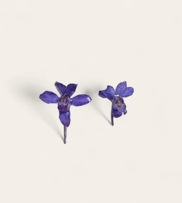 Zatopione w żywicy prawdziwe kwiaty ostróżeczki polnej (Consolida regalis), z rodziny Ranunculaceae. Ostróżeczkę polną można kojarzyć ze środowiskiem rolniczym. Króluje na polach, jednak jest niepożądaną rośliną w pobliżu upraw, ponieważ zawiera w sobie toksyczne alkaloidy pirolizydowe mogące zanieczyścić plony.